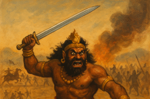 The 14th day was one of the bloodiest in the Mahabharata and also Alambush’s final day. He unleashed chaos on the battlefield, destroying over four hundred chariots that supported Bhima. He also killed many of Bhima’s soldiers, showing his unmatched destructive power.